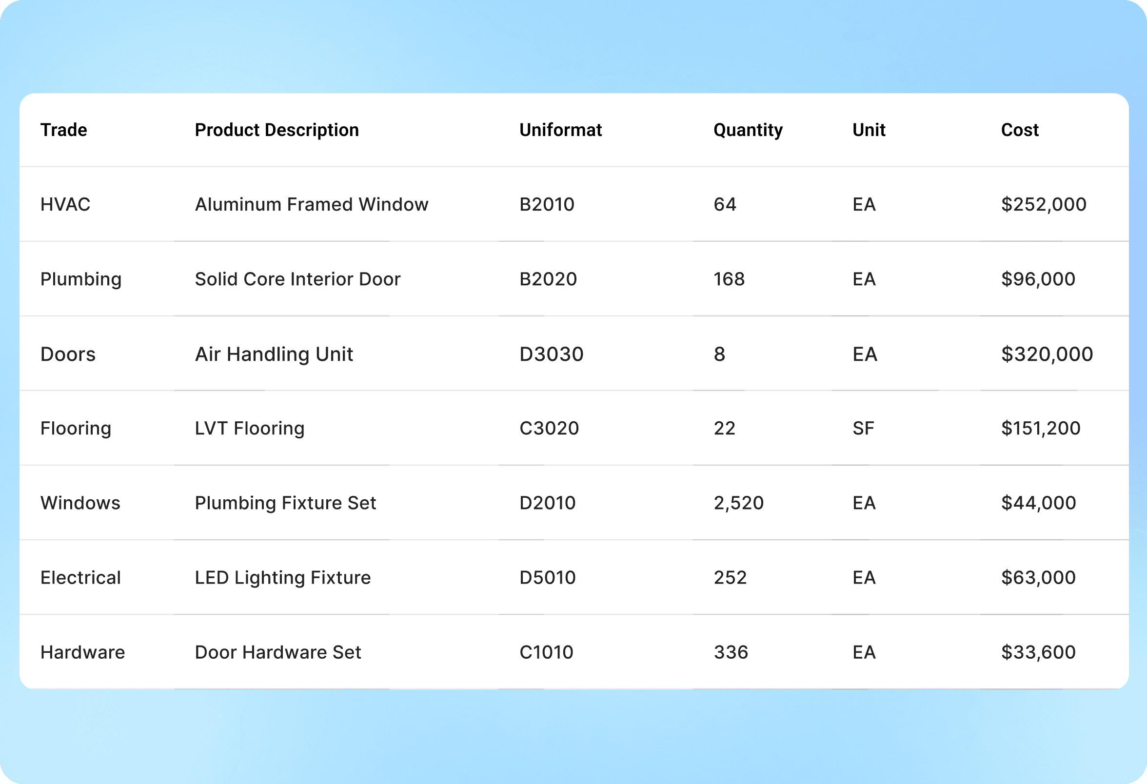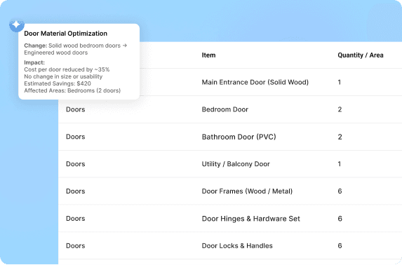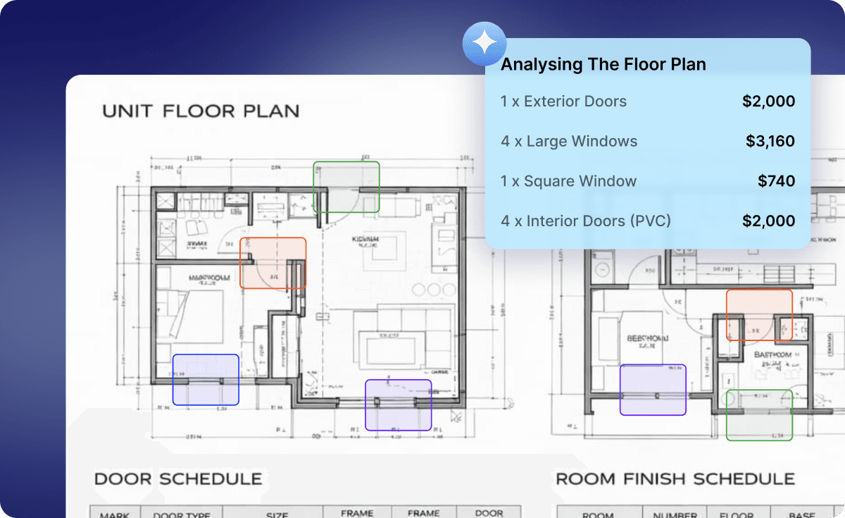 Calculates lengths, areas, and counts directly from drawings for fast, accurate estimates.