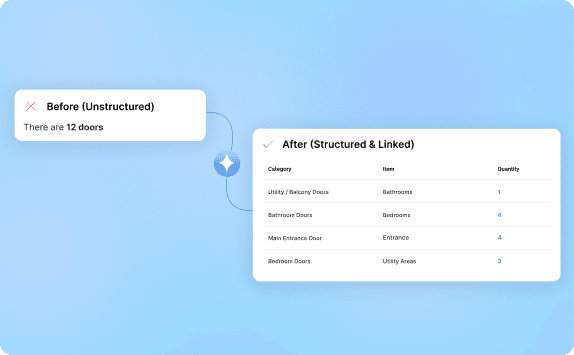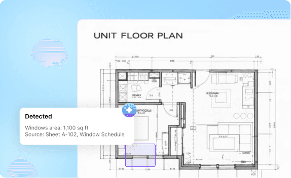 Ingests full plan sets—plans, elevations, sections, schedules—and builds a linked, queryable representation of the project.